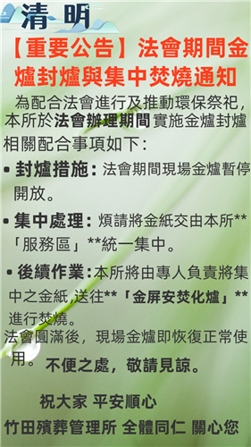 【重要公告】法會期間金爐封爐與集中焚燒通知